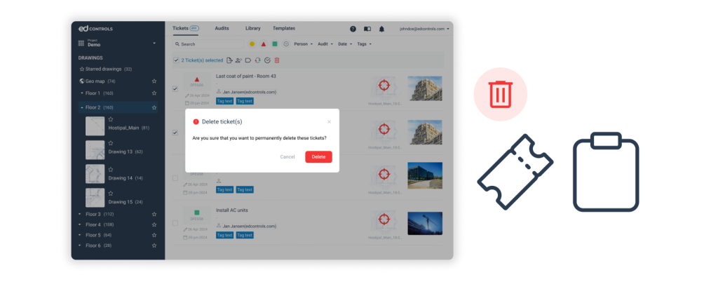 Second, contract admins can now delete audits and tickets older than 14 days, even if they have already been completed. This gives you the ability to correct errors, remove inappropriate content or manage exceptions. In this way, you will remove incorrect or incomplete audits and tickets, maintain the integrity of your projects, and be flexible to changing circumstances.